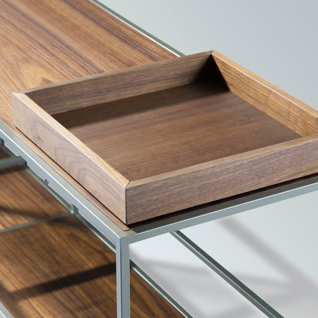 Estrutura em aço carbono pintado. Tampos em MDF laminado ou laqueado. Rodas giratórias em acrílico, laminada ou laqueada.
