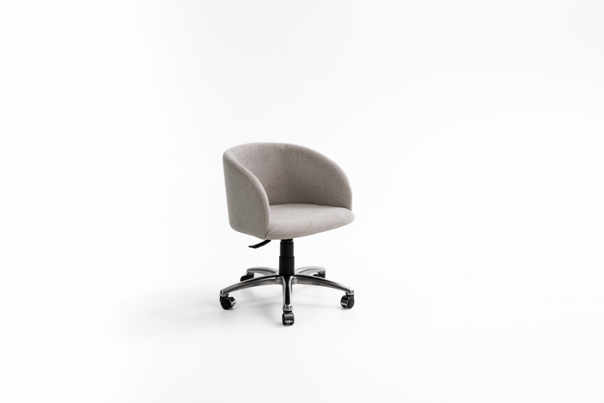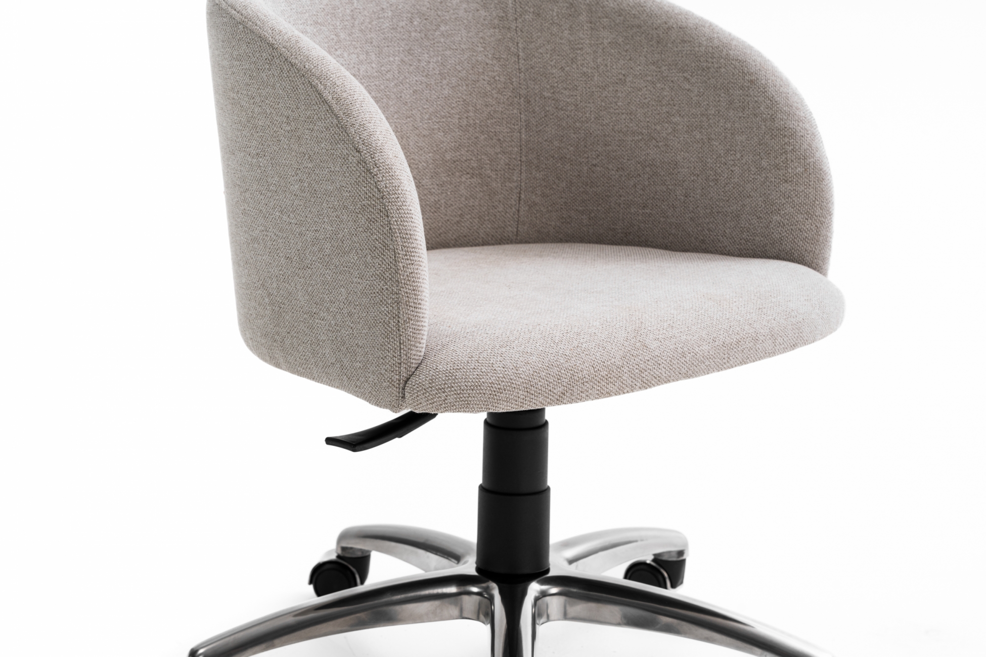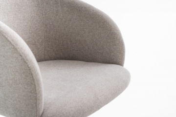 Assento envolvente com braços estofados e base em alumínio de acabamento refinado, com pistão e relax, criando uma cadeira de presença marcante.