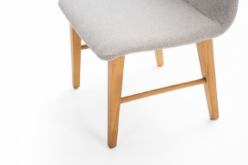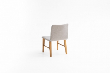 Cadeira com concha estofada e base em madeira tingida, perfeita para composições.
