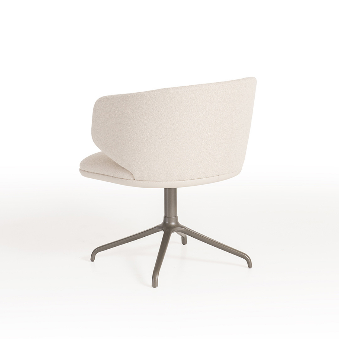 Concha e assento estofado. Detalhe inferior do assento pintado ou estofado. Base alumínio giratória pintada.