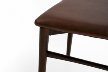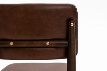 Cadeira com estrutura em madeira tingida, assento estofado e encosto disponível totalmente estofado ou laminado nas costas com frente estofada, valorizada por detalhes em dourado que transmitem sofisticação e presença.