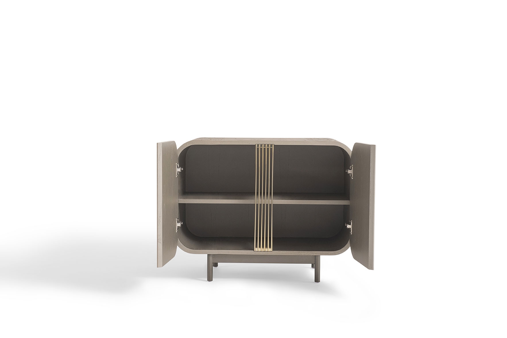Composta por móvel bar e mesa de cabeceira, essa linha traz como detalhe central para abertura das portas um elemento metálico com finas hastes que faz referência às cordas da Harpa, instrumento musical da antiguidade.