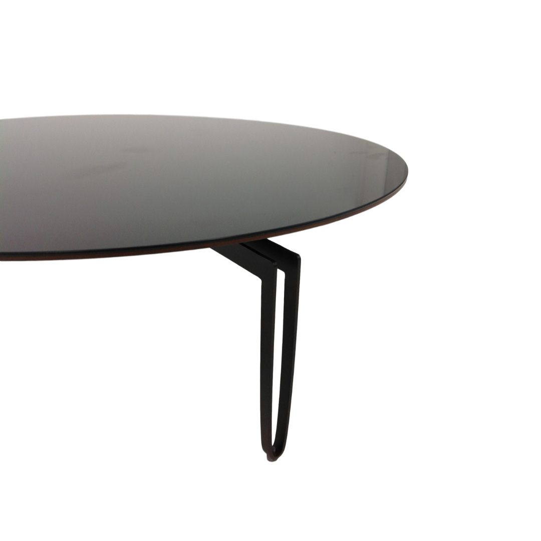 Mesa centro com tampo chanfrado MDF laminado, laqueado ou com vídeo pintado 4mm. Base aço carbono barra chata dobrada pintada ou laminada na parte externa.