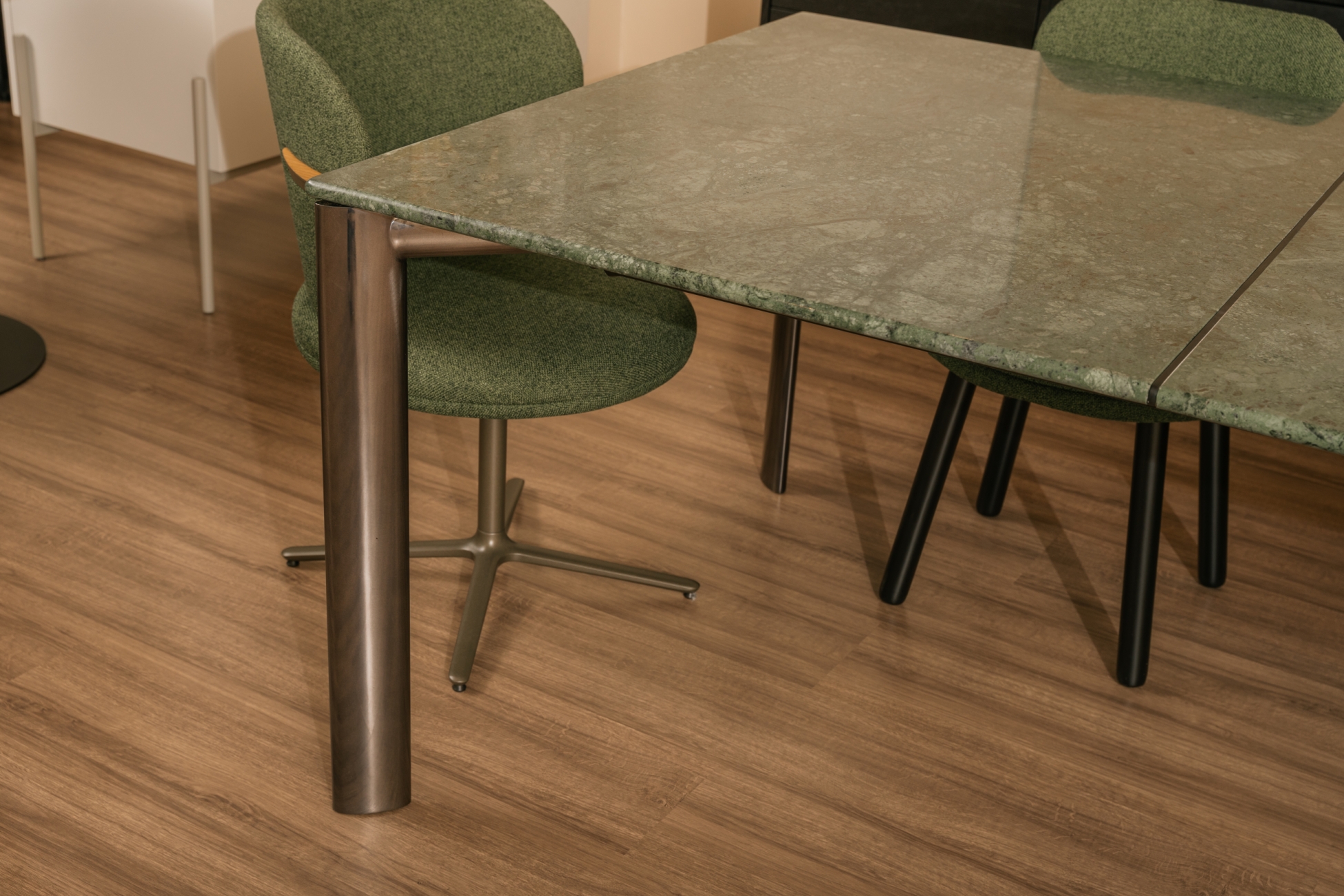 Mesa em aço inox elíptico polido ou tonalizado. Requadro em aço carbono pintado. Tampos em pedra.