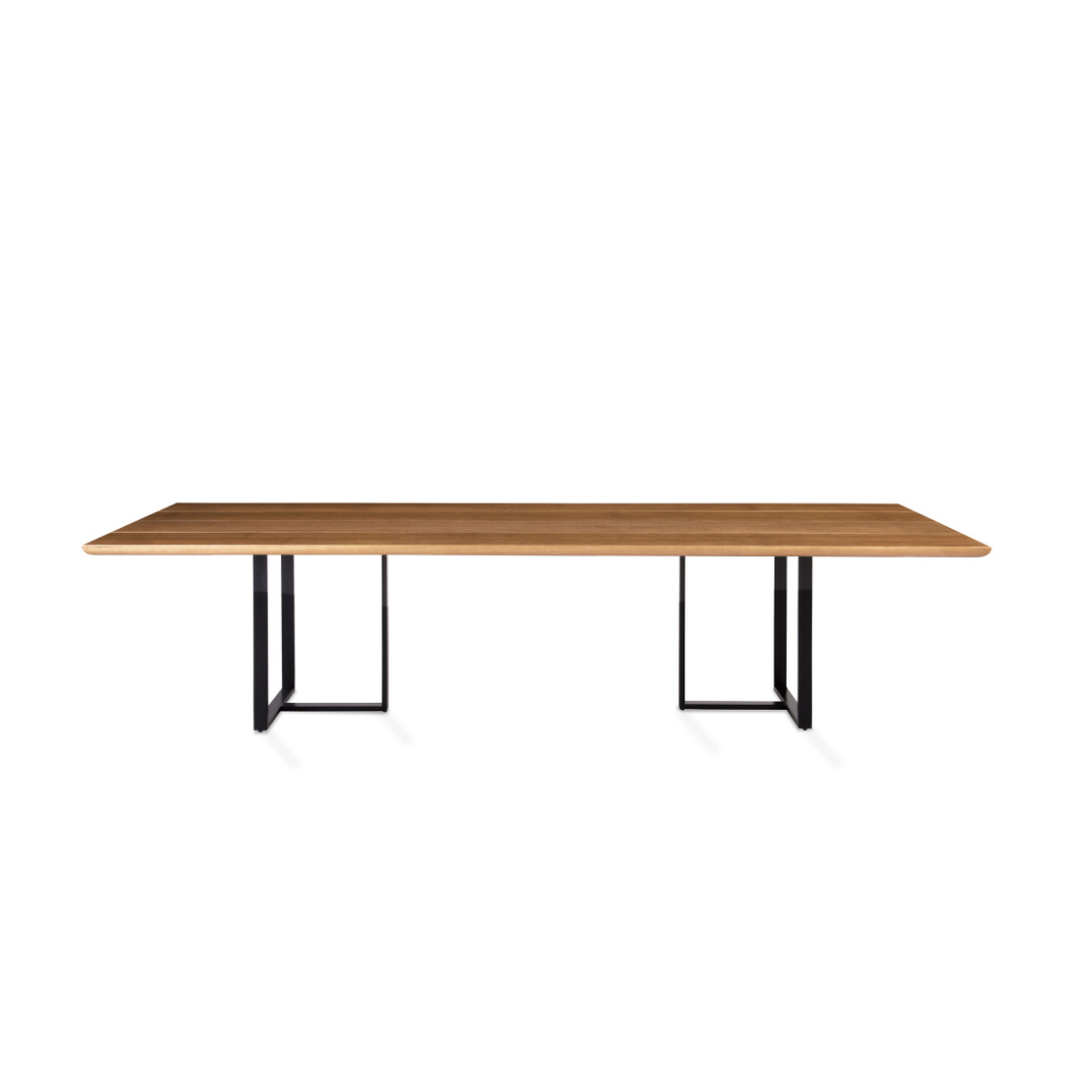 Mesa de jantar com tampo em tabuas maciças de Tauari natural ou tingida. Base em aço carbono pintado.