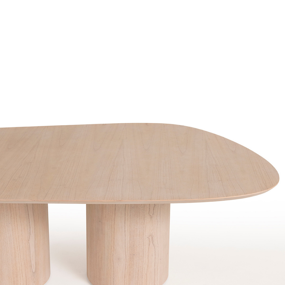 Mesa jantar orgânica. Tampos laminados, lacas foscas, microtexturas e vidro colado. Bases redondas laminadas, laca e microtextura.
