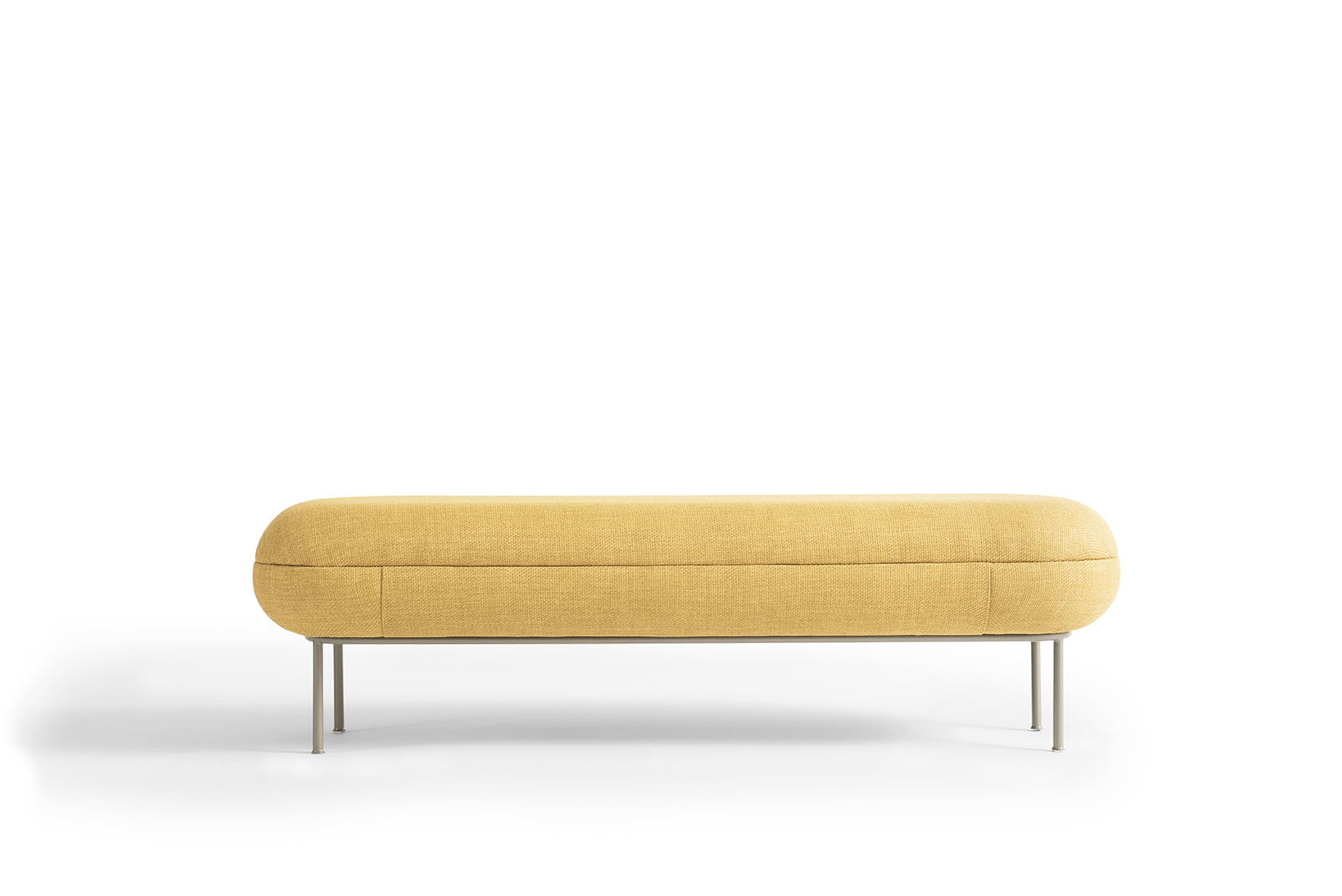 Banco com base aço carbono pintado, inox polido ou tonalizado. Assento estofado.