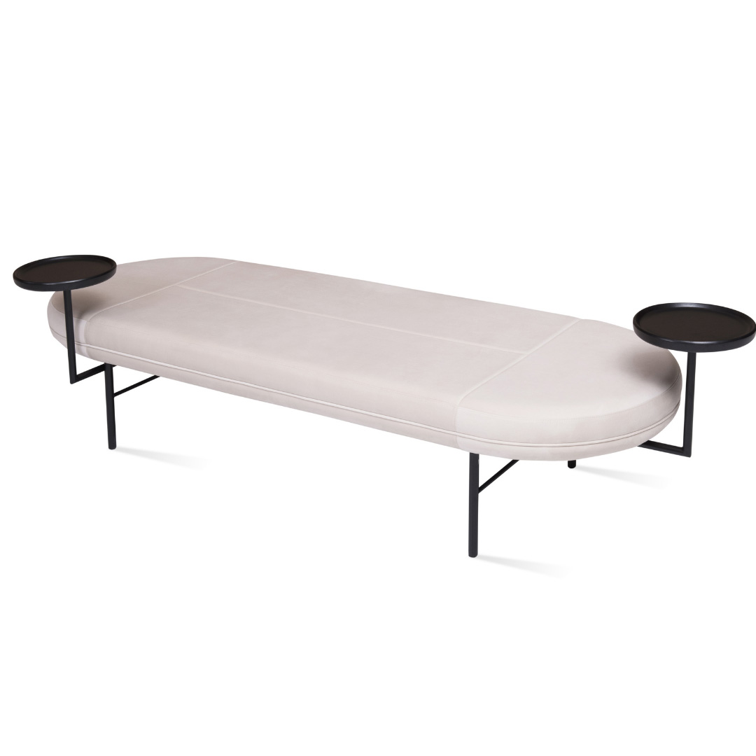 Estrutura e pés em aço carbono, acoplada com 2 mesas de apoio articulável em aço carbono. Bandeja em madeira tingida ou laqueada. Assento estofado.