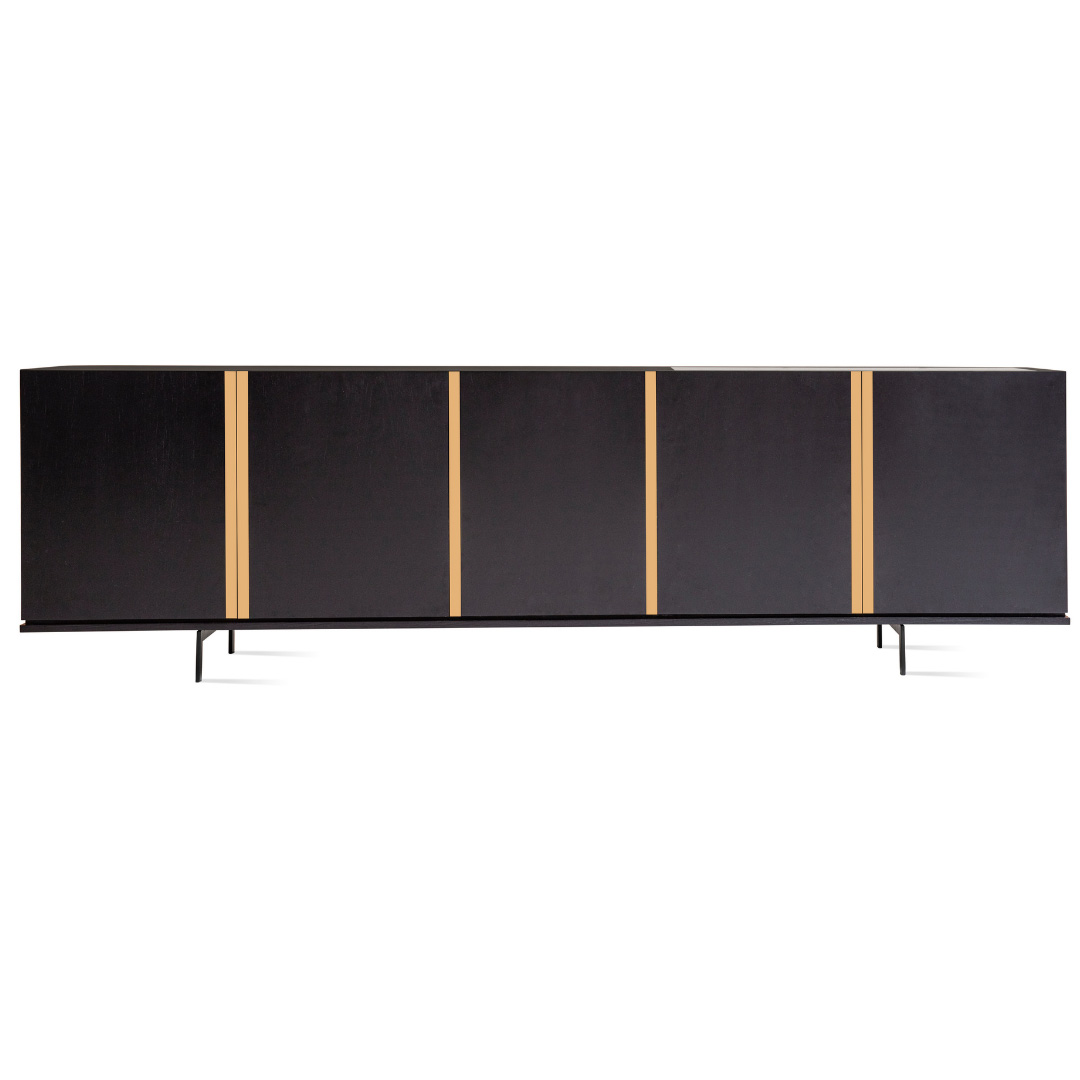 Base aço carbono pintado. Caixa em MDF laminado ou laqueado. Detalhe no tampo com vidro pintado ou com opção de rebaixe de 2cm para receber mármore. Filete de inox tonalizados entre as portas. Sistema de abrir fecho toque. Com 2 gavetas internas e prateleiras.