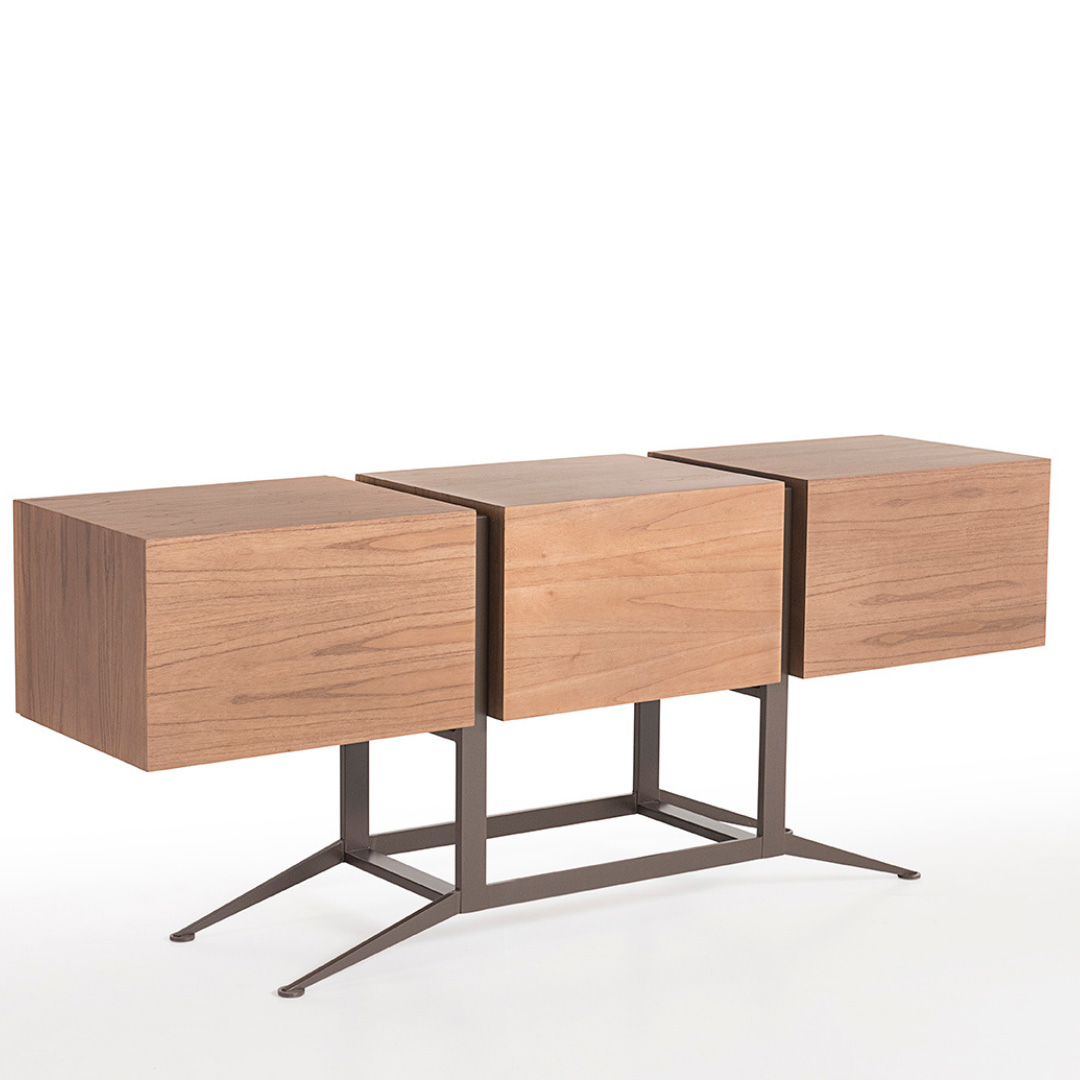Composto por 3 grandes caixas que se equilibram sobre uma estrutura em aço, Kubo é um Buffet que preza pela usabilidade e pela elegância de suas linhas e acabamentos nobres e exclusivos. Combinando madeira, palhinha de buriti e aço, é um produto com linhas clássicas que remetem à arquitetura moderna.