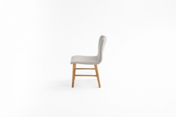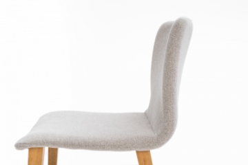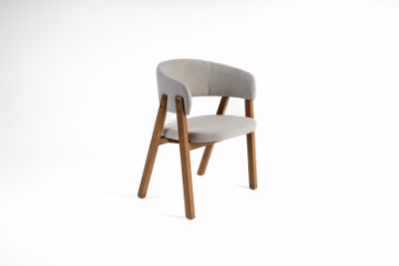 Cadeira com concha estofada e base em madeira tingida, perfeita para composições.