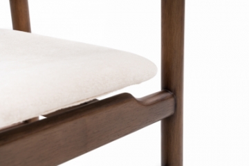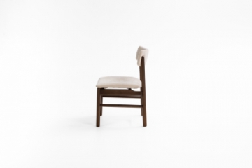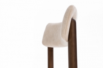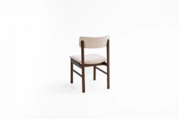 Cadeira com estrutura em madeira maciça tingida, disponível com assento e encosto estofados ou com assento estofado e encosto totalmente laminado. Design versátil que se adapta a diferentes estilos de ambiente.