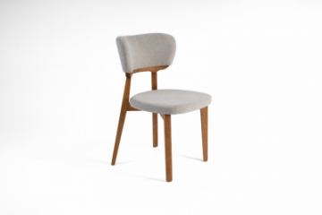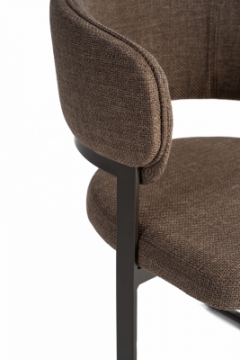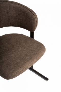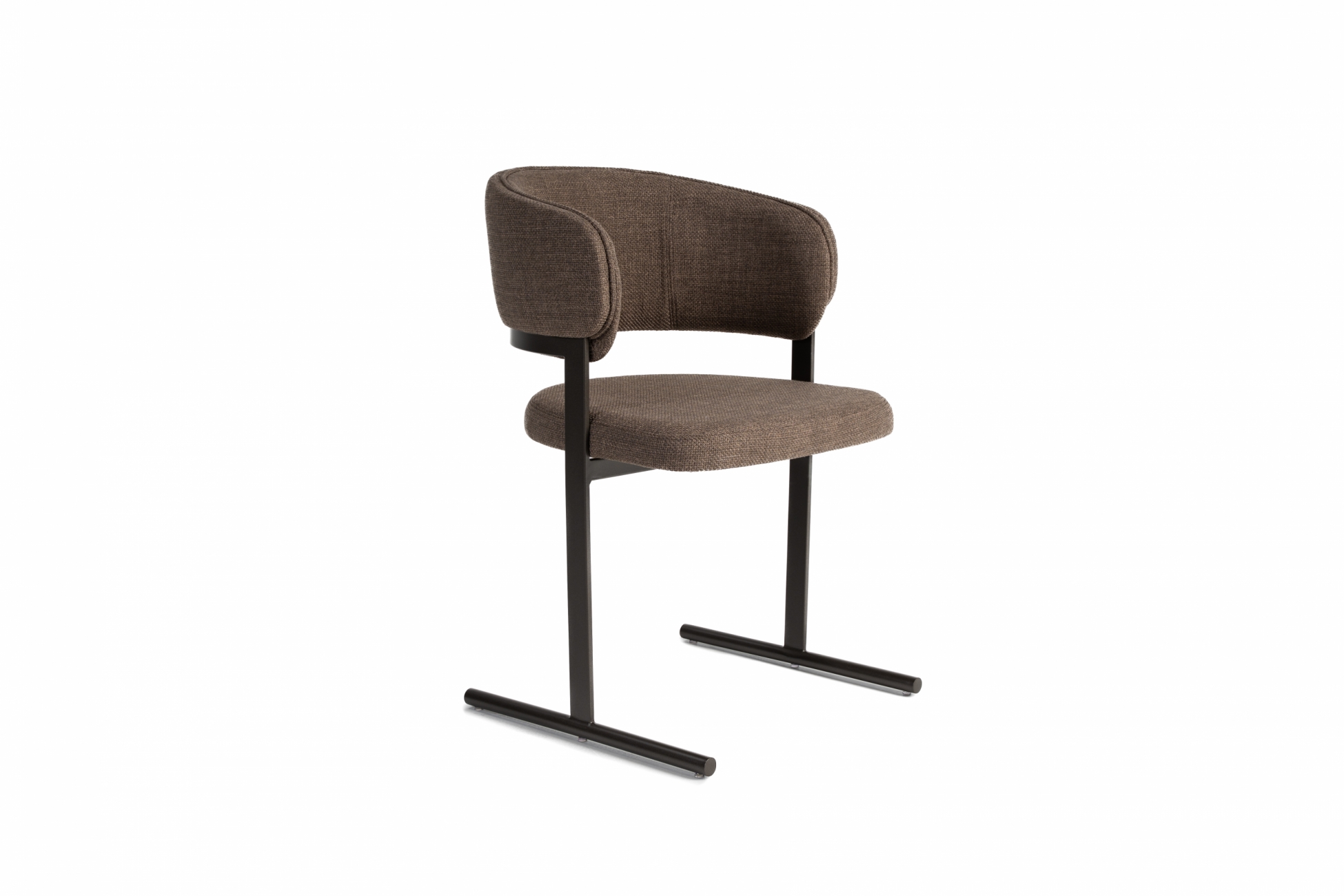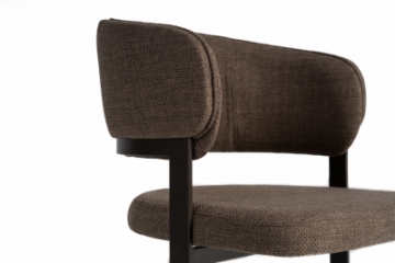 Cadeira com assento e encostos estofados e base em aço inox polido, inox tonalizado ou aço carbono pintado.