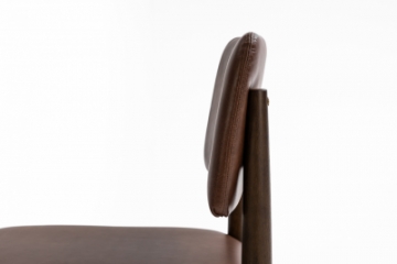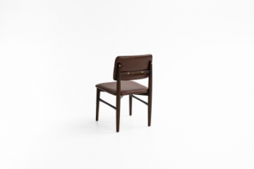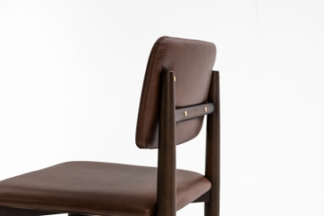 Cadeira com estrutura em madeira tingida, assento estofado e encosto disponível totalmente estofado ou laminado nas costas com frente estofada, valorizada por detalhes em dourado que transmitem sofisticação e presença.
