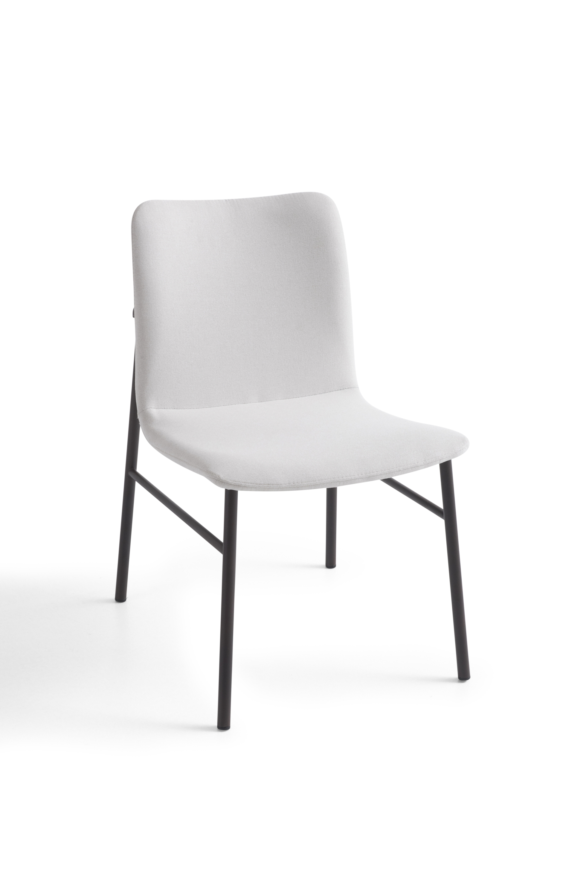 Cadeira estofada, estrutura aço carbono pintado, epoxi, concha multilaminada, detalhe aplique de madeira.