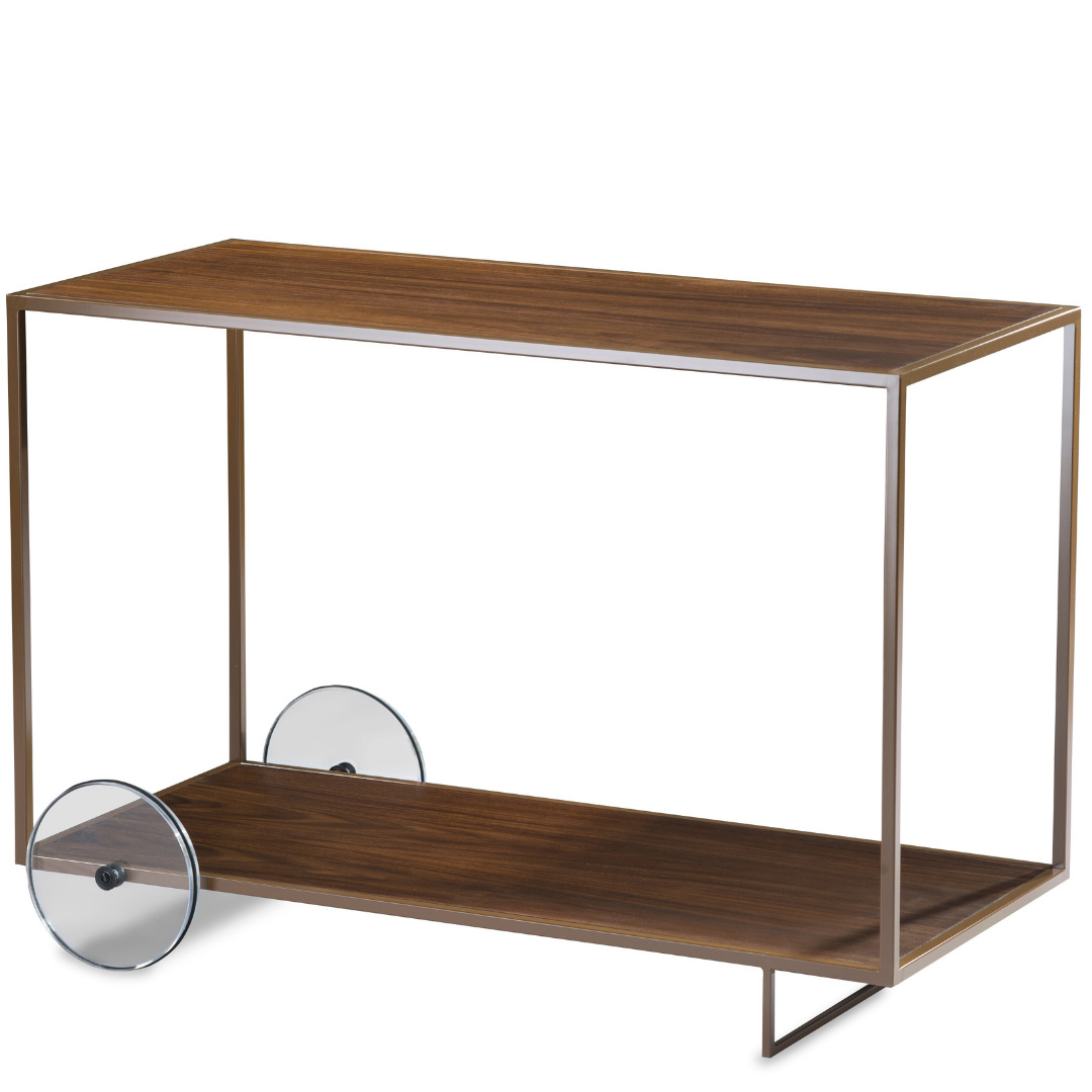 Estrutura em aço carbono pintado. Tampos em MDF laminado ou laqueado. Rodas giratórias em acrílico, laminada ou laqueada.