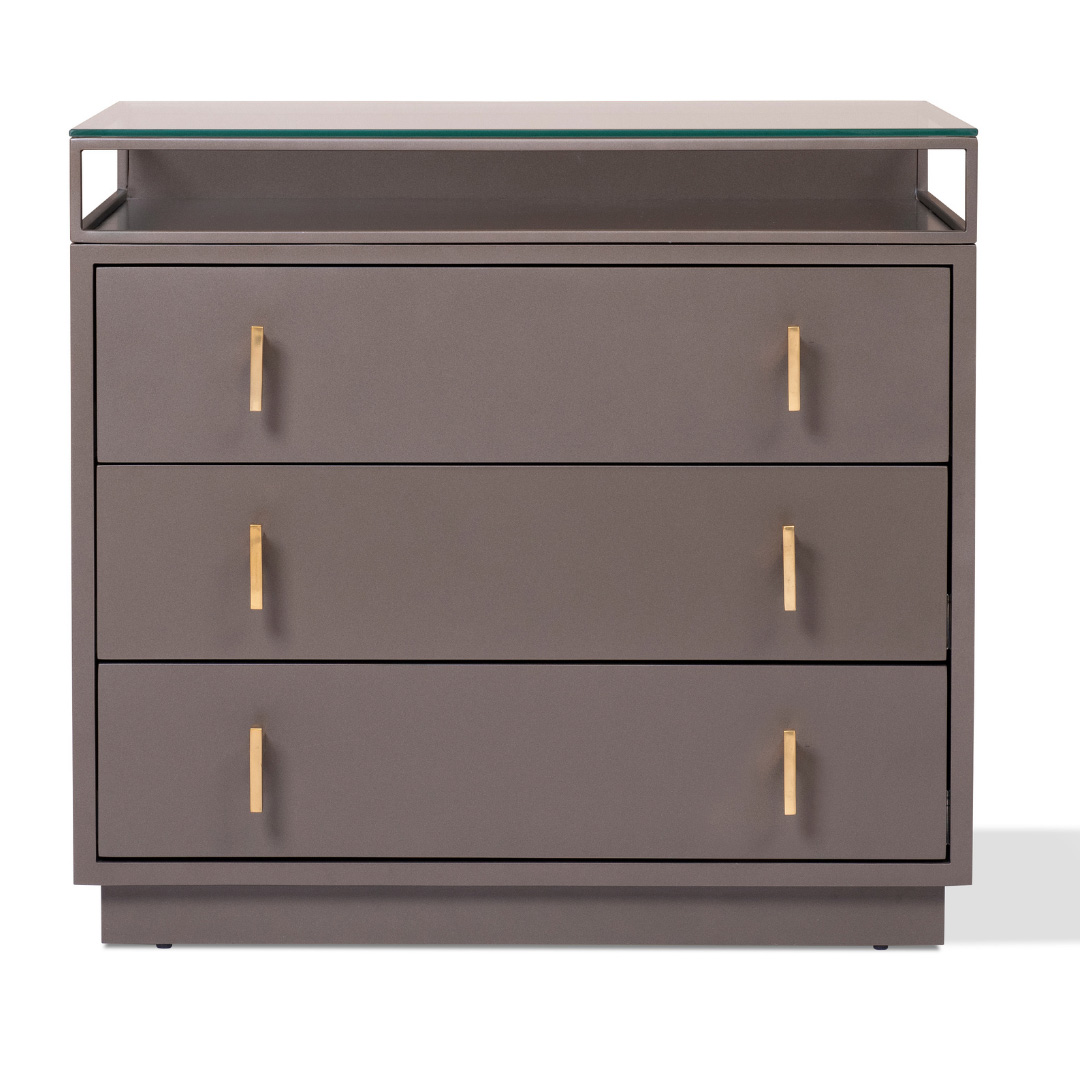 Caixote com 3 gavetas em MDF laminado ou laqueado. Puxadores tonalizados ou pintados. Suporte superior aço carbono com vidro 8mm incolor sobreposto.