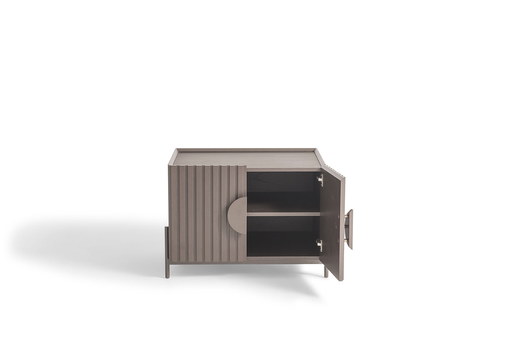 Mesa de cabeceira estrutura aço carbono pintada. Caixote e prateleira interna tingidas ou pintada. Portas somente pintadas.