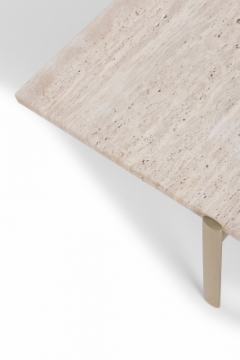 Mesa de Centro com estrutura em inox elíptico. Tampo composto por lâmina na parte maior e pedra na parte menor. Suporte do tampo em aço carbono.