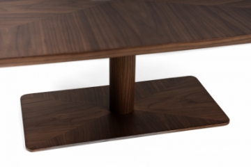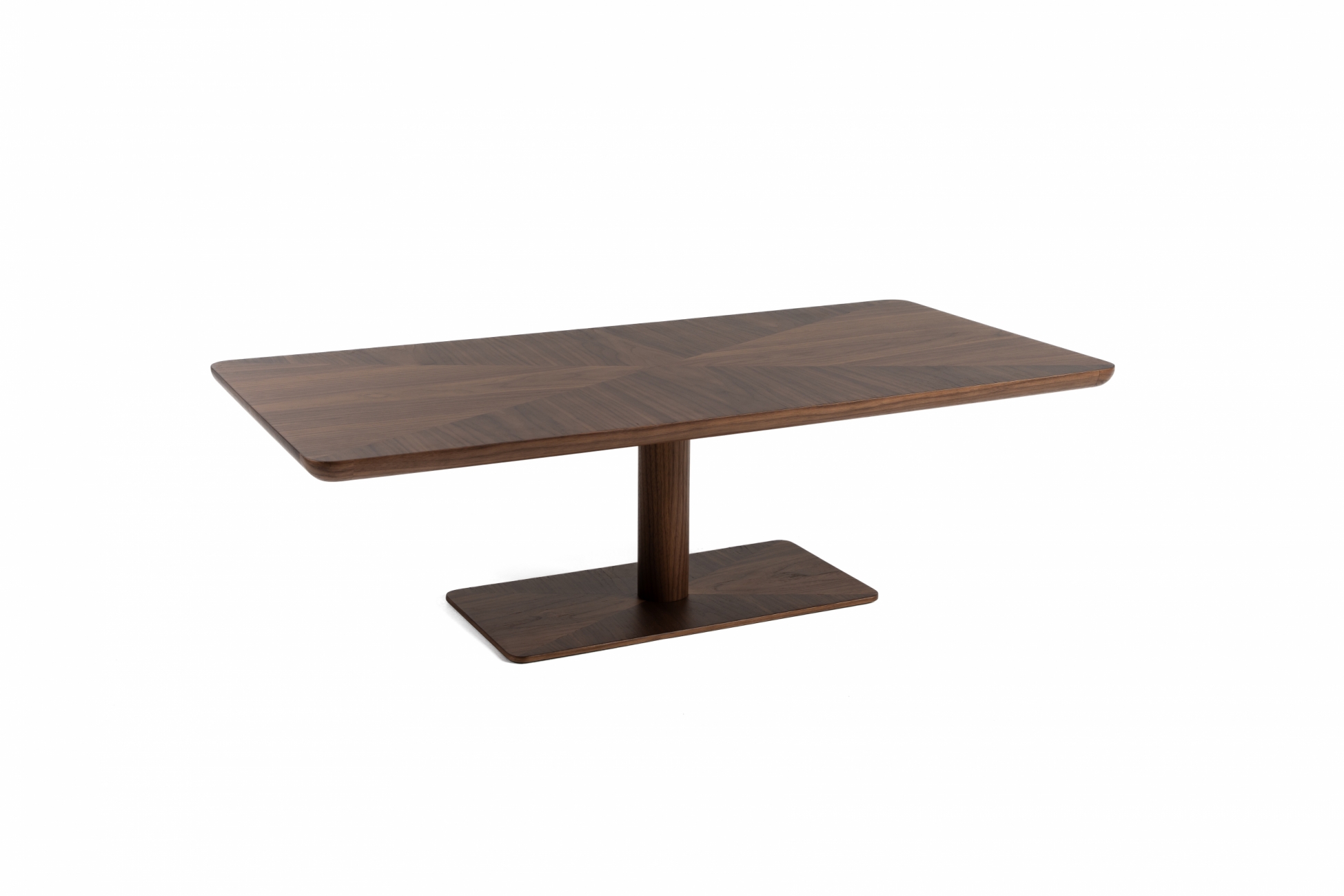 Mesa de centro laminada, com tampo em MDF marchetaria ou liso e base em aço carbono laminado ou pintado.