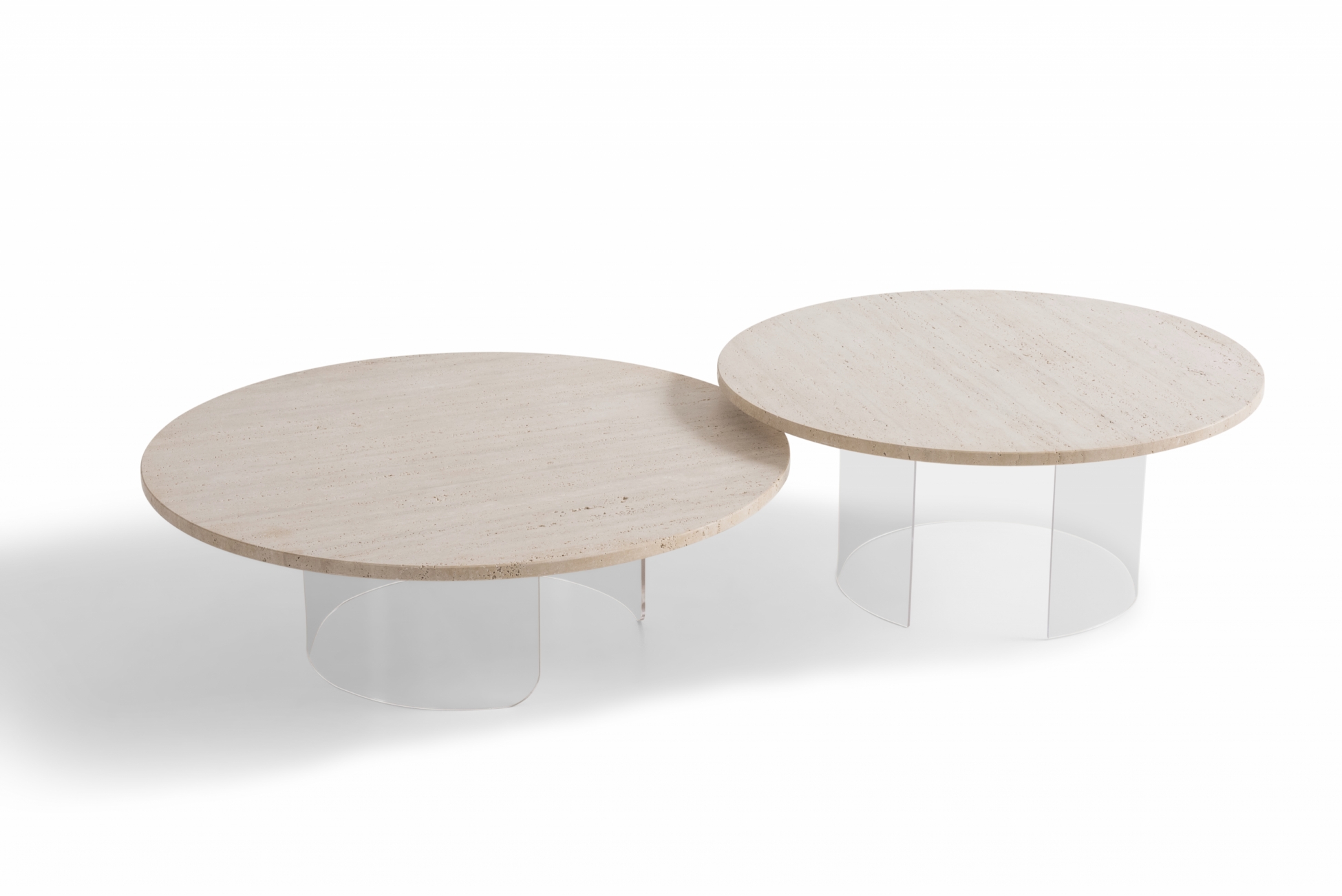 Mesa de centro redonda com base em acrílico 8mm e tampo em pedra.