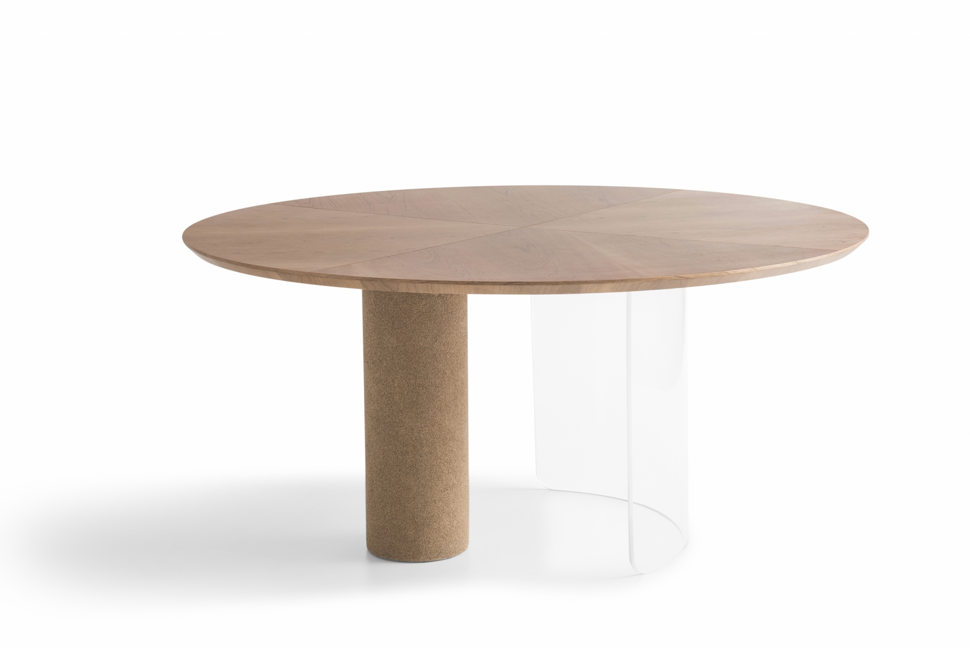 Mesa de Jantar redonda com base em acrílico 10 mm e coluna em compensado revestido. Tampo em laminado, laqueado ou vidro 4mm pintado e colado.