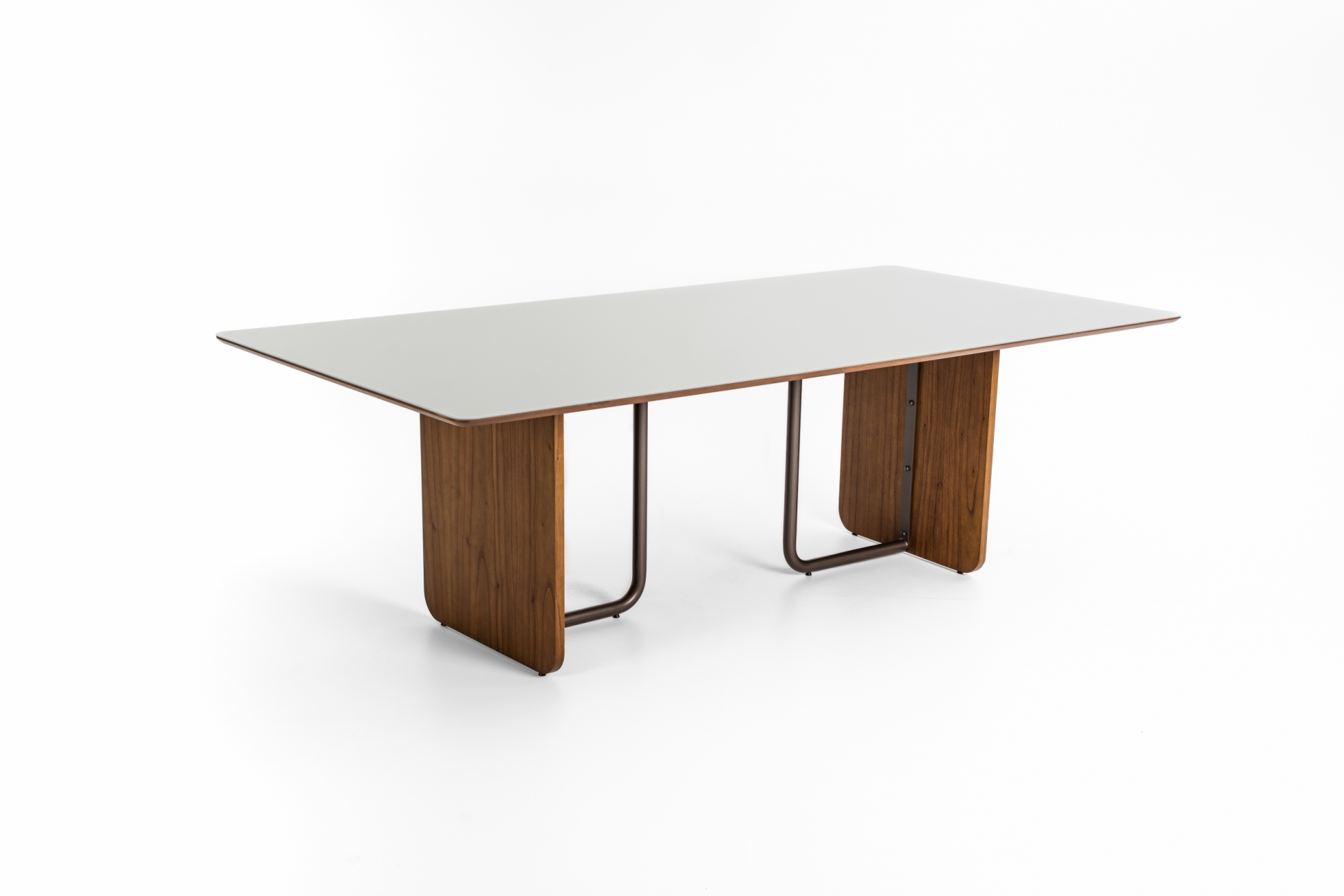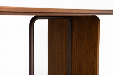Mesa de jantar com base laminada e detalhes em metal pintado, tampo em 18?mm laminado ou vidro pintado 4?mm.