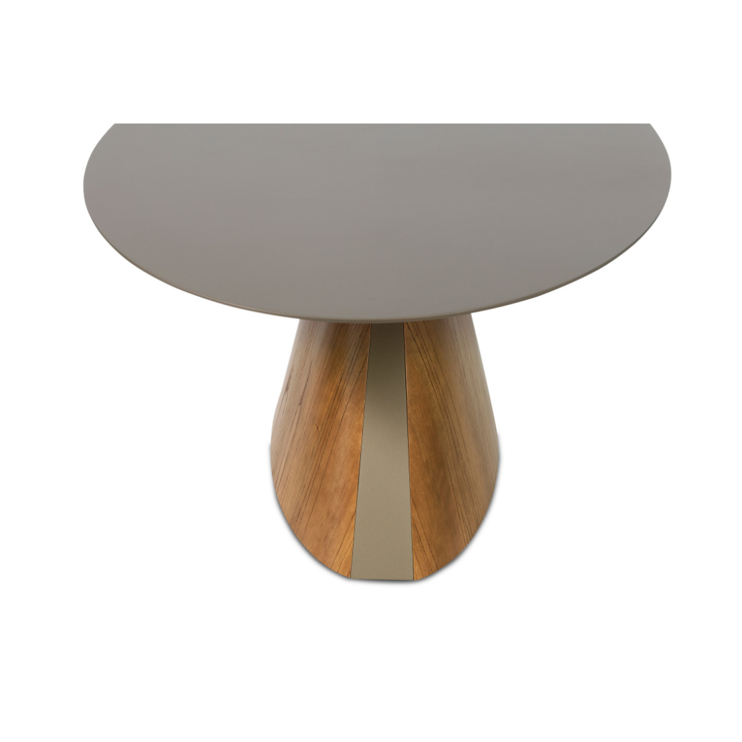Mesa oval com base cônica e detalhes nas laterais para realçar a forma. Esse detalhe permite fazer combinações entre o top e o detalhe nas laterais, como a costura de uma saia.