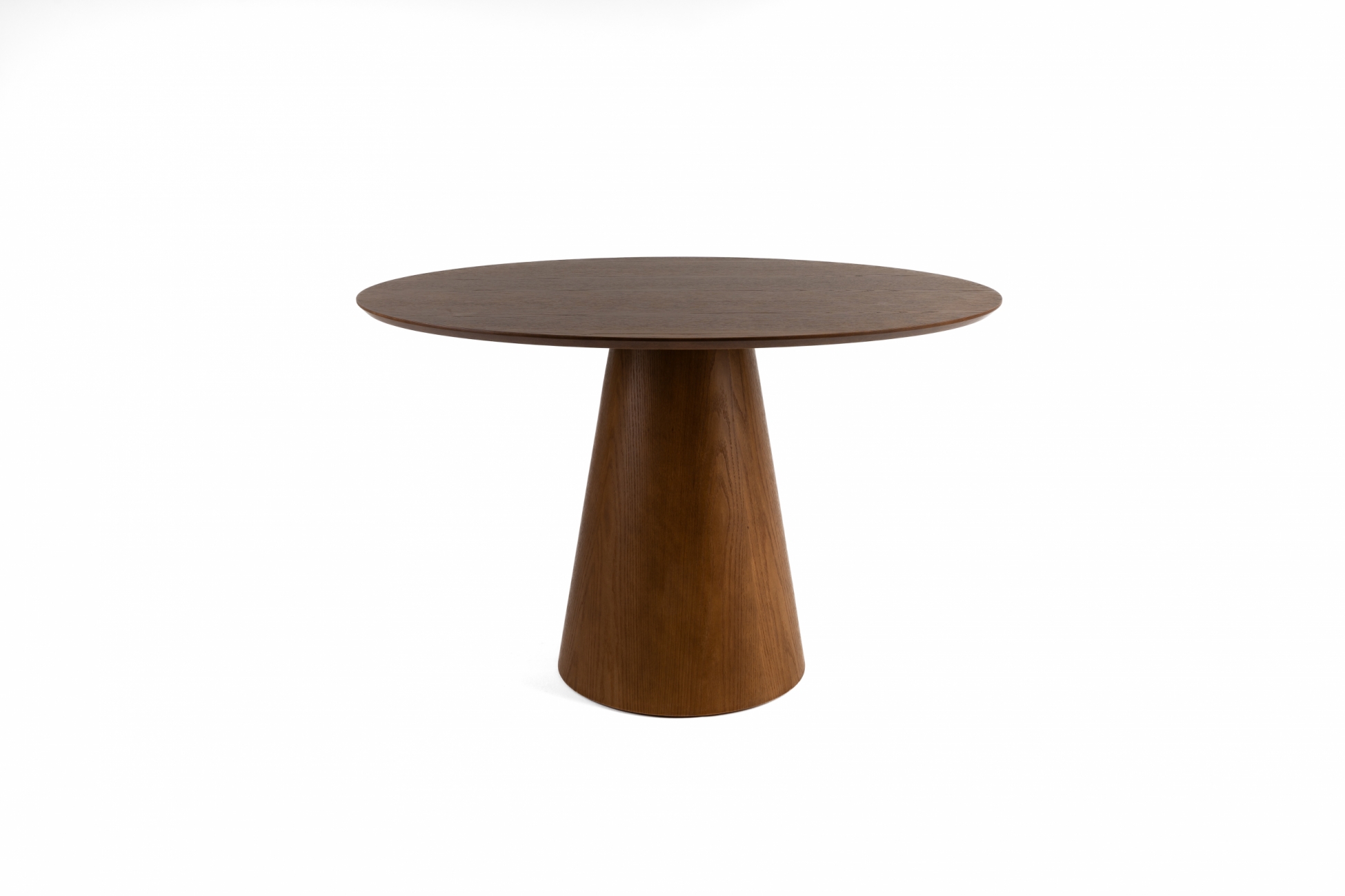 Mesa de jantar com base laminada ou laqueada e tampo redondo, em 18?mm ou vidro pintado 4?mm, projetada para oferecer elegância, resistência e sofisticação ao ambiente.