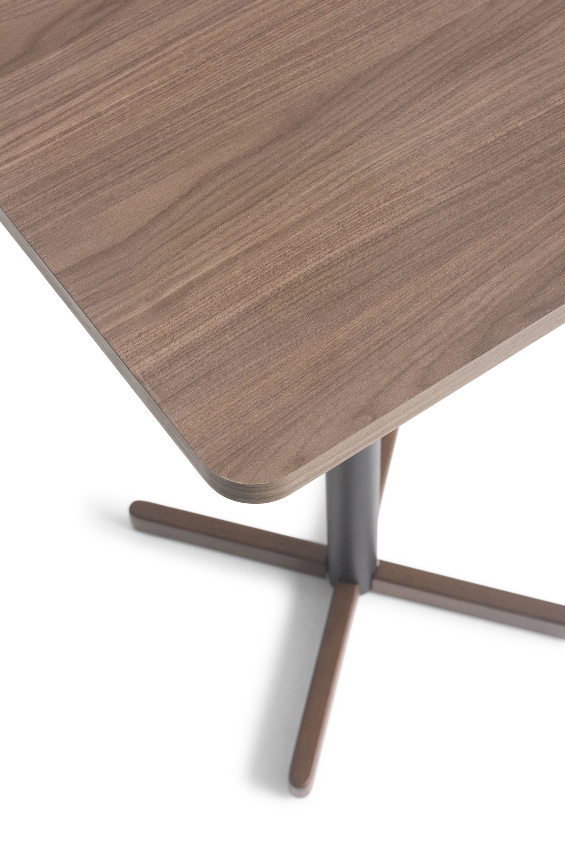 Mesa bistro base aço carbono pintado, detalhe nos pés da base em madeira maciça. Tampo MDF resvestido em Bp, lamina natural ou MDF com vidro pintado.