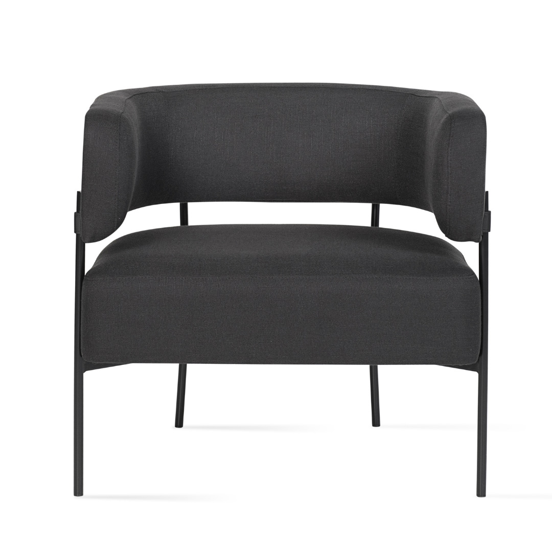Poltrona estofada. Pés aço carbono pintado, inox polido ou tonalizado.