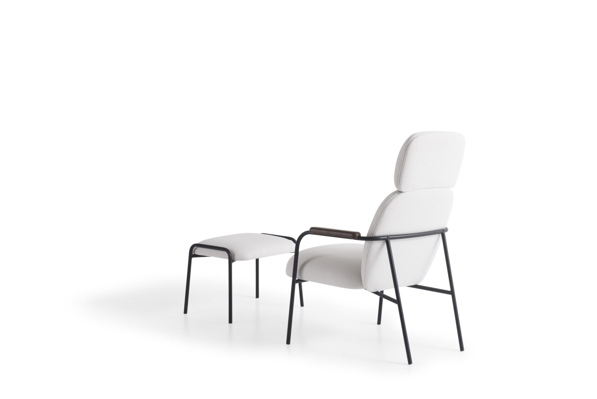 Poltrona estofada, base aço carbono pintura epoxi. Braços em madeira tingida.