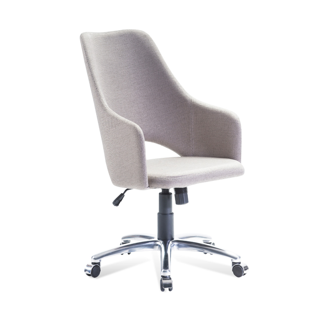 Poltrona estofada. Base girato?ria alumi?nio com rodi?zios, pista?o e relax.